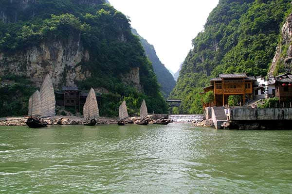 09:00进入葛洲坝船闸体验水涨船高的独特感受,观雄伟葛【葛洲坝全景】【西陵峡】乘船欣赏嫘祖庙、至喜亭、张飞擂鼓台、陈毅摩崖石刻、古军垒等;船观古栈道、观音坐莲台、石牌纪念碑、明月湾、石牌、灯影石等;船观巧夺天工的大自然杰作——仙人桥、剪刀峰、毛公山;体验莲沱、晒经坪优美传说,赏三峡大坝远景;